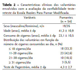 A etapa de avaliação de equivalência semântica e cultural das questões traduzidas foi realizada pela aplicação da versão traduzida em um grupo de 20 funcionários do Hospital das Clínicas de Ribeirão Preto, tabagistas de pelo menos um cigarro em dias alternados, que negavam comorbidades, abordados em momento de lazer, perto do horário de almoço, enquanto fumavam em uma área especialmente designada, externa ao prédio do Hospital. O teste de Fagerström para dependência de nicotina foi igualmente respondido, como medida da gravidade clínica do tabagismo.(14) As características desse grupo de voluntários estão listadas na Tabela 1.
