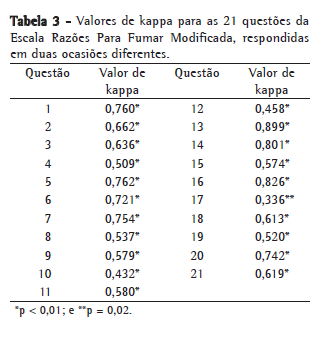 A avaliação da confiabilidade teste-reteste da presente versão portuguesa da ERPFM foi igualmente considerada satisfatória. De acordo com pontos de referência propostos na literatura, os graus de concordância das respostas em duas ocasiões distintas podem ser classificados como "quase perfeito" para 2 questões, "substancial" para 10 questões, "moderado" para 8 questões e "discreto" para 1 questão (Tabela 3).(17)