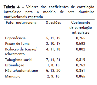 O grau de concordância entre os fatores motivacionais obtidos nas duas ocasiões, empregando-se os modelos teóricos de artigos previamente publicados, também foi elevado.(8-10) Os valores dos CCI obtidos foram superiores a 0,7 em seis dos sete domínios, valor que denota excelente concordância (Tabela 4).(18)