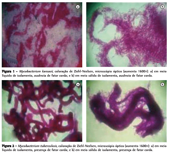 É possível a observação do fator corda em MNT, pois estas produzem 'pseudocordas', isto é, crescimento em cordas incompleto, onde a interpretação dependerá da experiência técnica (Figura 1). Do total de cepas analisadas, 17 MNT (12%) foram descritas como fator corda positivo, sendo 53% dessas identificadas como M. kansasii. Esses números são considerados elevados quando comparados aos de outros autores;(11,16) porém, ressaltamos que tais estudos não revelam o isolamento de M. kansasii, além de serem em menor proporção (16,9%) que os apresentados por conhecido autor.(12)