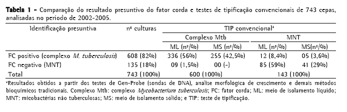 Objetivo: O Mycobacterium tuberculosis, sob certas condições apropriadas, cresce em cordões de serpentinas, denominados de fator corda, ou crescimento em cordas. O objetivo deste estudo é avaliar a detecção do fator corda como método de identificação presuntiva do complexo M. tuberculosis, comparando-o aos testes de tipificação (TIP) convencionais. Método: Foram analisadas 743 cepas, de janeiro de 2002 a dezembro de 2005, na Área de Micobactérias do Instituto Adolfo Lutz - Santos, obtidas de isolados clínicos coletados de pacientes sintomáticos
