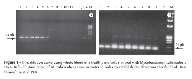 For the sake of standardization and more efficacious results, we used purified genomic DNA of the M. tuberculosis reference strain (H37Rv), using an extraction kit (Tissue and Cells GenomicPrep; Amersham Biosciences, Piscataway, NJ, USA), according to the manufacturer instructions. In order to determine the detection threshold through nPCR, we used a serial dilution curve factor 10, ranging from 10 ng to 0.01 fg. Subsequently, purified DNA was added to the blood of a healthy individual. We used the DNA of this strain as positive control in the amplification reactions.