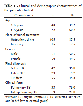 In the present study, 120 patients were evaluated; 93 with initial suspicion of the disease and 27 control individuals. The median age was 7.00 ± 0.42 years. There was no significant difference in relation to the gender of the individuals. According to the final diagnosis, the individuals were characterized as follows (Table 1): active TB; latent TB; ruled out TB; and control (uninfected individuals).