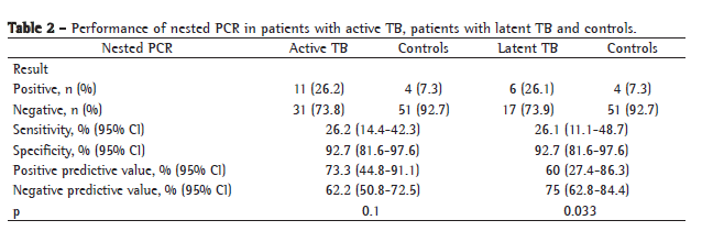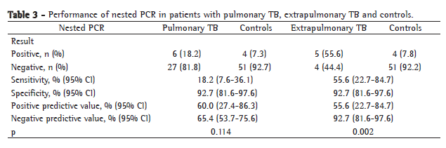 The performance of the PCR system has proven to be more promising for the diagnosis of TB in adults, especially in the pulmonary form, when sputum is used as biological sample.(24,25) In contrast, the use of nPCR in blood samples is important in the attempt to elucidate cases of the disease in the pulmonary or paucibacillary forms, in which the sputum smear microscopy is negative or when there is no expectoration.