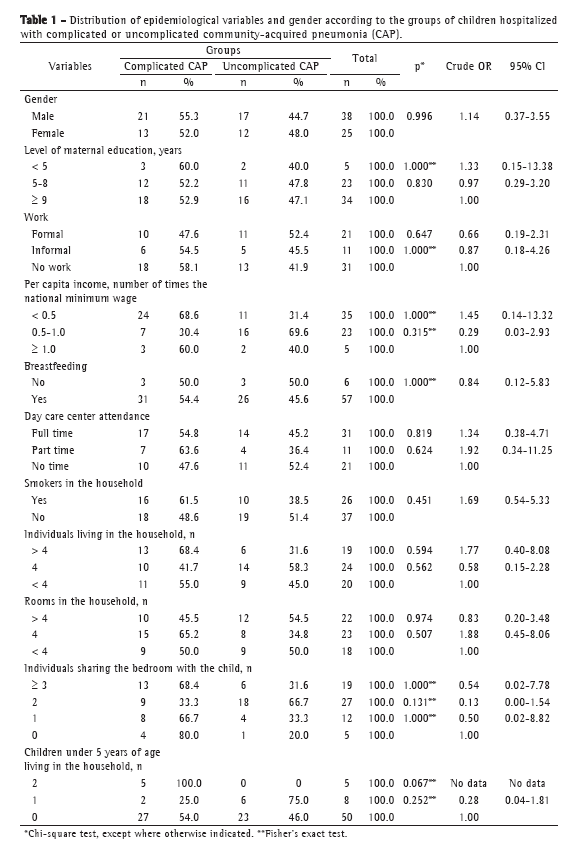 Children with cystic fibrosis, heart disease with hemodynamic repercussions, pulmonary malformations, neurological disorders, or genetic diseases were excluded from the study. Data were collected from the medical records and with a semi-structured questionnaire comprising closed questions. The questionnaire was administered to the parents/legal guardians of the CAP patients at the time of admission to the pediatric ward. The main variables studied were gestational age at birth, breastfeeding, chronological age at admission, gender, level of maternal education, maternal employment status, family income, day care center attendance, smoking, housing conditions, comorbidities (a history of pneumonia and recurrent wheezing), previous use of antibiotics, complications, clinical variables, and variables related to disease progression. The children were divided into two groups (complicated and uncomplicated CAP).