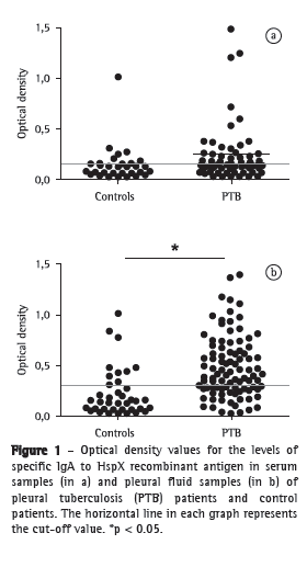 Recent studies have demonstrated that the presence of HspX recombinant antigen-Rv2031c-in serum can be related to latent TB and to active pulmonary TB.(6,7) However, TGF-β, one of the many cytokines induced by Mycobacterium tuberculosis, is increased in patients with pleural TB, as well as being involved in the regulation of the cellular immune response and in the induction of IgA production.(8,9)