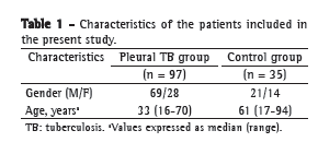 ResultsWe evaluated 175 individuals with pleural effusion and suspected of having pleural TB. Of those, 43 were excluded from the study: 13 because of sample hemolysis; and 30 because the final diagnosis was unknown. Therefore, we selected 132 patients. Of those, 97 were diagnosed with pleural TB, and 35 were diagnosed with diseases other than TB (metastatic cancer, congestive heart failure, liver failure, systemic lupus erythematosus, and parapneumonic effusion). The 35 patients who were diagnosed with diseases other than TB constituted the control group. We evaluated serum and PF samples collected from the 132 patients. Table 1 shows the profiles of the individuals included in the present study. Figure 1 shows the optical density values obtained by indirect ELISA in serum and PF samples. As can be seen in Figure 1A, the serum levels of IgA were higher in the patients with pleural TB than in the control group patients (0.244 ± 0.377 vs. 0.137 ± 0.174). However, the difference was not statistically significant (p > 0.05). Nevertheless, as can be seen in Figure 1B, IgA levels were significantly higher in the PF of patients with pleural TB than in that of patients in the control group (0.481 ± 0.300 vs. 0.203 ± 0.204; p < 0.05).