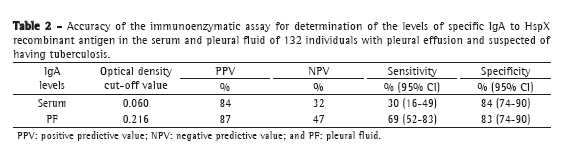 The various studies mentioned here suggest that, although immunoenzymatic assays can detect latent M. tuberculosis infection, as well as active pulmonary or extrapulmonary TB, none have proved sufficiently accurate to warrant their use. The results obtained by determining the levels of specific IgA to HspX recombinant antigen in PF samples in the present study reignite this discussion and stimulate further studies in this line of research. Studies involving larger samples in which the control groups comprise a larger number of cases of pleural effusion caused by other infectious agents-cases that can be clinically and radiologically mistaken for TB-should be conducted, as should studies involving immunocompromised individuals. It is of note that the use of other antigens in combination with HspX recombinant antigen can increase the sensitivity of the test by as much as 20% and constitutes an additional resource that can be employed in future studies.(24)