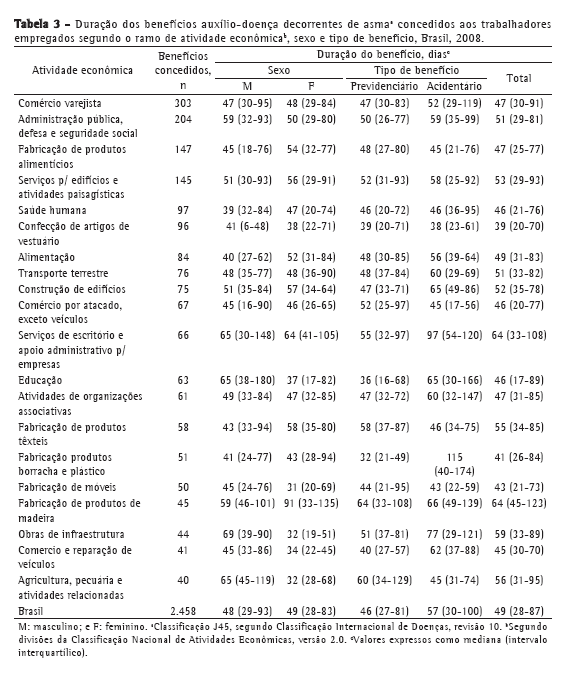 A Tabela 3 traz as medianas e intervalos interquartílicos (II) da duração dos benefícios auxílio-doença por ITA, segundo a divisão da CNAE, sexo e espécie do benefício. A mediana geral da duração dos benefícios por asma foi de 49 dias (II: 28-87 dias). Os benefícios auxílio-doença acidentários foram, no geral, mais longos do que os previdenciários. Divisões da CNAE, como "serviços de escritório, de apoio administrativo e outros serviços prestados às empresas" e "fabricação de produtos de madeira", apresentaram as maiores medianas de duração de benefícios. Quando analisadas apenas as medianas de duração dos auxílios-doença concedidos aos homens, encontrou-se uma maior duração no ramo "obras e infraestrutura". As mulheres apresentaram maior mediana de duração de benefícios na divisão "fabricação de veículos automotores, reboques e carrocerias". Entre os benefícios previdenciários, a maior duração ficou entre os empregados do ramo "fabricação de produtos de madeira". Entre os acidentários, o destaque foi para o ramo "fabricação de produtos de borracha e material plástico".