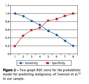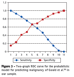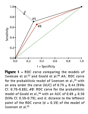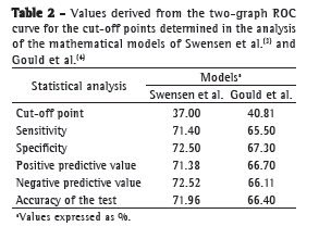 For our sample, we found that the mathematical model of Swensen et al.(3) was superior to that of Gould et al;(4) through analysis of superimposed ROC curves, we observed a greater AUC for the former, as well as a narrower range between the reliable cut-off points. This behavior demonstrated that, in our sample, the mathematical model proposed by Swensen et al.(3) had a higher diagnostic accuracy. Recently, in a study conducted in the USA, the two models were compared and were found to have very similar behaviors,(16) a finding that is in disagreement with ours.