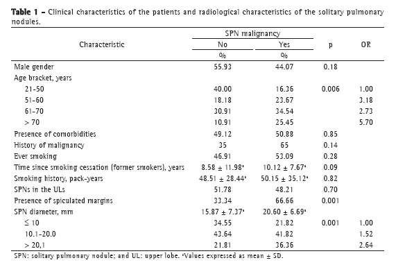We evaluated 110 patients. Of those, 59 were male and 51 were female. We found no significant association between gender and the diagnosis of SPN malignancy. The same was true for presence of comorbidities, history of malignancy prior to the diagnosis of SPN, and smoking status. Neither the number of years since smoking cessation nor smoking history in pack-years had any influence on the pathological diagnosis of SPN. The only clinical characteristic that was significantly associated with SPN malignancy was age (p = 0.006), when it was stratified into groups, with increasing ORs, culminating in an OR of 5.70 for the > 70 year age group (Table 1).