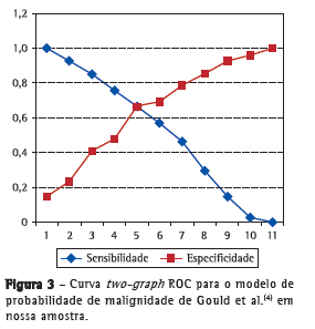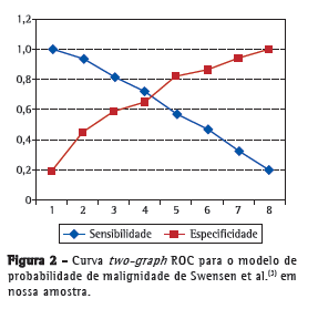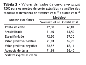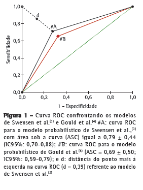 A análise comparativa entre os métodos demonstrou que o modelo de Swensen et al.,(3) em comparação ao de Gould et al.,(4) apresentou melhor rendimento, com sensibilidade, especificidade e acurácia maiores.
