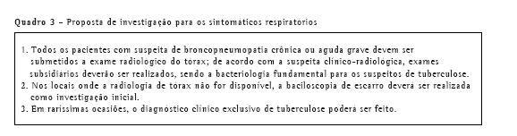 Para completar, duvidamos que algum pneumologista siga a proposta diagnóstica das Diretrizes em suas atividades diárias para os sintomáticos respiratórios, suspeitos ou não de serem portadores de tuberculose. Pelo contrário, a experiência demonstra que o primeiro exame complementar nestes casos é invariavelmente a radiografia do tórax, que servirá de orientação para a complementação diagnóstica.