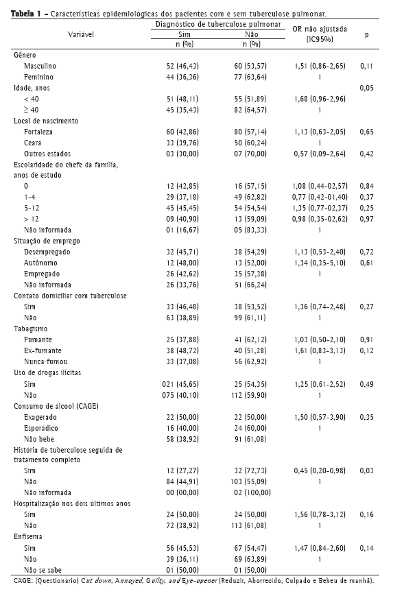 Pacientes que procuraram atendimento médico em qualquer uma de três unidades de saúde de referência em Fortaleza (CE) e que apresentavam tosse por  2 semanas foram convidados a participar do presente estudo. Nosso objetivo foi identificar fatores sociodemográficos, clínicos e comportamentais associados ao diagnóstico de tuberculose pulmonar.
