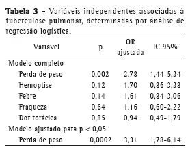 Em nossa amostra (pacientes com mais de 14 anos de idade que procuraram atendimento médico em uma clínica de referência em área endêmica e que apresentavam tosse por  2 semanas), a perda de peso foi o único sintoma que se mostrou significativamente associado à tuberculose pulmonar. De maneira similar, em um estudo recente com 1.435 crianças que viviam em uma área com alta carga de tuberculose na África, onde a prevalência da doença era de 1,3%, a perda de peso foi a única variável clínica que diferiu significativamente entre os pacientes com tuberculose e aqueles sem a doença.(15)