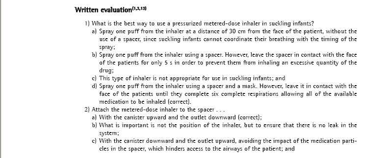 In a randomized controlled study conducted in a hospital in Philadelphia, the skills of resident physicians in the use of pressurized metered-dose inhalers with spacers were evaluated before and after the implementation of a theoretical and practical educational program. The residents were divided into two groups, a study group and a control group, those in the latter being submitted only to the application of the written and practical questionnaire, at the beginning of the study and after 2 to 3 months, without the implementation of the educational program. The residents submitted to the theoretical and practical educational program performed significantly better, both in relation to their initial performance and in relation to the performance of the control group, at the end of the study.(13)