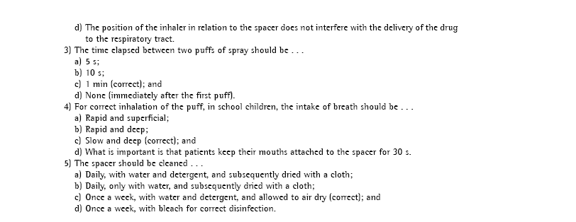 The third part of the interview consisted of closed questions with direct responses regarding the following aspects: use of the spacer; type of spacer; waiting time between two consecutive puffs of the metered-dose inhaler; proper breathing technique prior to the inhalation; duration of the breath hold after inhalation; cleaning of the mouth after inhaler use (Annex 1). There were five questions, each worth 2 points, and the overall score obtained also ranged from 0 to 10.