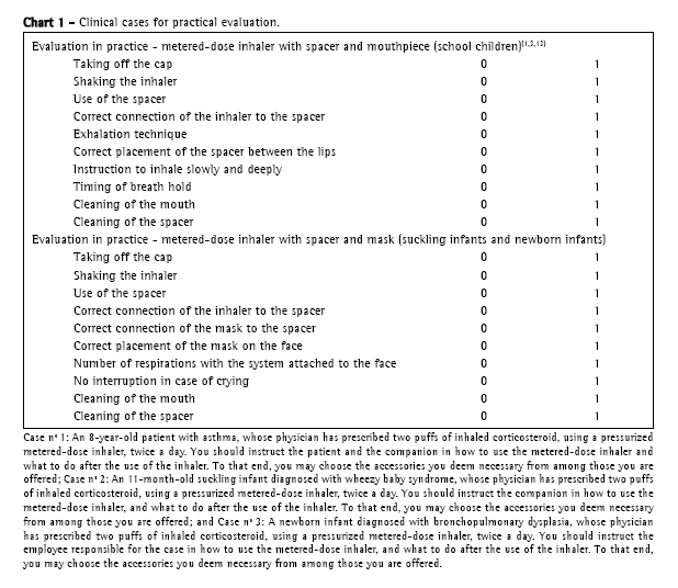 Treatment failure in individuals with asthma frequently results from the incorrect use of metered-dose inhalers, which is typically a consequence of a lack of counseling by health professionals, many of whom are unfamiliar with the technique.(10) A multicenter study for the evaluation of inhalation technique among over 800 European health professionals and their patients, published in 1998, revealed that only 9% of patients, 15% of nurses and 28% of physicians used metered-dose inhalers correctly.(10) There have been no Brazilian or Latin-American studies regarding the skills of health professionals in the use of pressurized metered-dose inhalers.