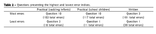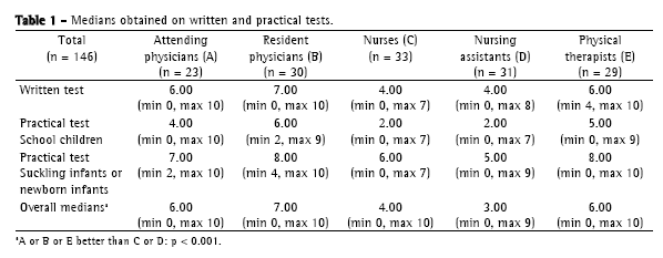 The medians obtained in each type of test are presented in Table 1. The best medians, in absolute values, were obtained by resident physicians, followed by physical therapists, attending physicians, nurses and nursing assistants. Comparing the overall performance of the categories, the performance of resident physicians, physical therapists and adolescents and their performance on the practical attending physicians was significantly better than test for adolescents (p > 0.05 for both categories). that of nurses and nursing assistants (p < 0.001 Attending physicians, nurses and nursing assist-for all three categories). There were no significant ants performed significantly better on the practical differences in performance when we compared test for suckling infants than on the practical test attending physicians with residents (p > 0.05), resi-for adolescents (p < 0.001 for the three categodents with physical therapists (p > 0.05), physical ries), and their performance on the written test therapists with attending physicians (p > 0.05), and for adolescents was significantly better than their nurses with nursing assistants (p > 0.05). performance on the practical test for adolescents
