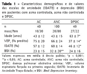 A população de asmáticos constituiu-se predominantemente de mulheres, e era mais jovem em relação ao grupo com DPOC. O volume expiratório forçado no primeiro segundo médio dos asmáticos esteve em torno de 70% do previsto, enquanto que nos portadores de DPOC, esteve abaixo de 40%. Na Tabela 1 podemos comparar os dados demográficos dos grupos e verificar que os asmáticos possuem um valor médio de IDATE significativamente mais alto que o grupo com DPOC, independentemente de estarem ou não controlados. Em relação ao BDI a média ficou entre 20 a 30%. Verifica-se uma pequena, mas significativa, diferença para maior no percentual de depressão do grupo com asma não controlada quando comparado aos outros dois grupos.
