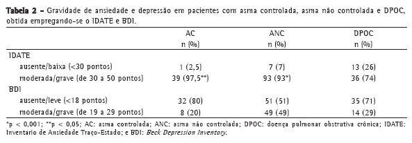 Como mostrado na Tabela 2, a análise estratificada por gravidade não encontrou diferença significativa em relação aos níveis de depressão. Mas quanto à ansiedade, houve prevalência significativamente maior de ansiedade moderada e grave entre asmáticos não controlados quando comparados a pacientes com DPOC (p < 0,001), e asmáticos controlados quando comparados com portadores de DPOC (p < 0,05).