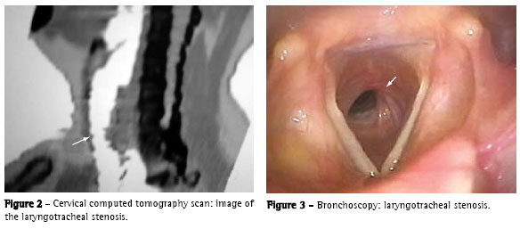 A 33-year-old, white female patient, who was a nonsmoker, presented with progressive dyspnea and loud respiratory sounds, both of which worsened upon exertion, especially in the last year. Bronchoscopy was performed and revealed highgrade (90%), short-segment laryngotracheal stenosis. The patient also underwent dilatation, performed using a rigid bronchoscope, and a two-week course of corticosteroid therapy was prescribed. Outpatient follow-up was carried out for one year and nine months, during which time the patient remained completely asymptomatic. She reported a history of cranial trauma at the age of nine years, at which time she had remained intubated for a few hours.