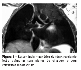Paciente de 26 anos, sexo feminino, internada para a investigação de massa tumoral em lobo superior esquerdo, com invasão mediastinal e de parede torácica. Queixava-se de dor torácica há 60 dias, sem irradiação, que não melhorava ao uso de analgésicos, acompanhada de febre diária, dispneia, queda do estado geral e tosse produtiva com expectoração mucoide. Negava perda ponderal, hemoptise, cefaleia e outros sintomas neurológicos.
