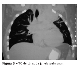 Foi encaminhada ao serviço de cirurgia torácica para investigação diagnóstica. A ressonância magnética mostrava uma lesão de contornos irregulares com captação de contraste, medindo aproximadamente 9,2 × 7,2 × 6,0 cm, ocupando a totalidade do lobo superior esquerdo, com invasão mediastinal e da parede torácica, e envolvendo a artéria carótida comum esquerda, a subclávia esquerda e parte do arco aórtico (Figura 1). Foi submetida à TC de tórax, a qual mostrou invasão das referidas estruturas e aderência da lesão aos corpos vertebrais, com invasão da fossa supraclavicular esquerda (Figuras 2 e 3).