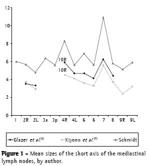 In addition, the concept of lymph node enlargement is fundamental to the understanding of several diseases. Although there is controversy regarding the definition of an ideal value, various authors have adopted a maximum of 1 cm on the short axis to define normal lymph node size.(1-6) However, the patient samples evaluated in Brazilian studies of diseases with mediastinal lymph node involvement are not comparable in size to those evaluated in American, English, and Japanese studies.