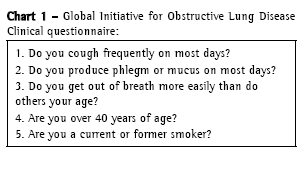 The participants completed the clinical questionnaire developed for the Global Initiative for Obstructive Lung Disease (Chart 1), which is a worldwide project that aims to raise awareness of COPD, as well as to improve prevention and treatment of this lung disease. Those who responded affirmatively to three or more questions underwent spirometry. The combination of three or more positive responses and spirometric alterations (FEV1/FVC < 70%) was used in the diagnostic screening for COPD.Spirometry was performed according to the guidelines established by the American Thoracic Society(11) and by the Brazilian Consensus on Spirometry.(1) A minimum of two acceptable and reproducible maneuvers were performed in each test. Post-bronchodilator tests were not used. The tests were performed using a MicroLoop portable spirometer (ML3535, Micro Medical, Kent, UK), which allowed the collection of the FEV6 and of the FEV1/FEV6 ratio through the use of the SPIDA 5 software.