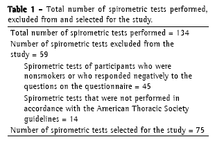 The data regarding the total number of spirometric tests performed, as well as that of those excluded from and selected for the study, are shown in Table 1.Data regarding the population selected for the study (n = 75) are shown in Table 2.