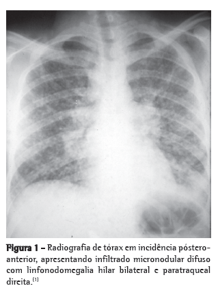Exames radiográficosOs exames radiográficos não são específicos para o diagnóstico dessa micose. Na histoplasmose pulmonar aguda, o aspecto radiográfico mais frequente é a presença de linfonodomegalias hilares bilaterais e mediastinais associadas a infiltrado reticulonodular peri-hilar bilateral (Figura 1). Porém, linfonodomegalia hilar unilateral, infiltrado intersticial reticulonodular difuso, cavidades e nódulos difusos ou isolados podem ser encontrados. Na histoplasmose pulmonar crônica, o aspecto radiográfico se assemelha ao da tuberculose do adulto ou de reinfecção, isto é, infiltrado progressivo em lobo superior, cavidades e sinais de fibrose. O alargamento do mediastino pode ser visto principalmente na TC de tórax nos casos de histoplasmose granulomatosa e fibrose mediastinal. Nódulo solitário ou nódulos múltiplos com calcificação central são muito característicos da forma nodular, isto é, do histoplasmoma.(1-5)