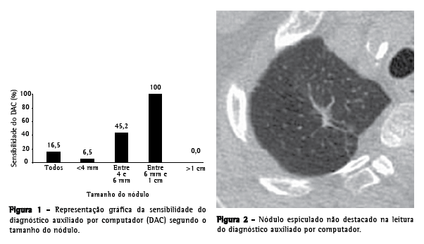 Um outro fator a ser analisado é que a comparação da sensibilidade do DAC foi feita com dupla leitura realizada por profissionais com pelo menos 5 anos de experiência em radiologia do tórax e, apesar de estudos recentes mostrarem que o DAC aumenta significativamente a detecção de nódulos pulmonares independentemente do número de leitores,(27-29) talvez sua maior contribuição seja em situações menos ideais, com apenas um leitor e/ou profissionais menos experientes.(25,30) O fato de os radiologistas estarem ativamente procurando por nódulos durante o processo de dupla leitura também deve ser considerado, já que é uma situação artificial e que influencia positivamente na sensibilidade da detecção destes.