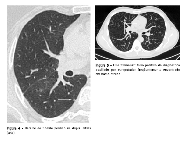 A média de falsos positivos por exame (10,9), apesar de estar dentro da faixa encontrada em outros estudos, que varia entre 3 e 13 falsos positivos por TC de tórax,(21) não é desprezível, sendo um fator de desgaste e que consome tempo na revisão dos dados fornecidos pelo computador. Os falsos positivos encontrados foram, principalmente, estruturas vasculares, e estão de acordo com os referidos na literatura, exceto pelas estruturas hilares (Figura 5), que não são especificamente citadas com freqüência.(9,19,22)