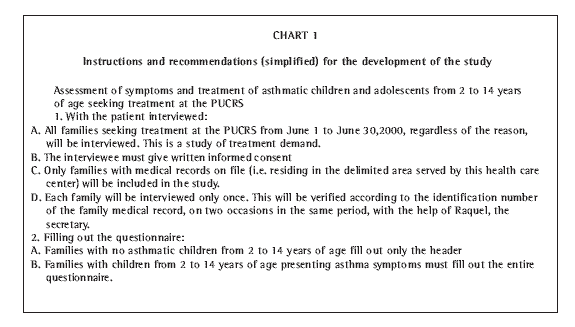 All families seeking medical attention of any type at the PUCRS during the period from June 1 to June 30, 2000 were interviewed. These families resided with the delimited area consisting of four census sectors and therefore had medical records on file at this health care center. Each interview was carried only out after written informed consent had been obtained. During the period studied, the PUCRS had 1560 family medical records on file. The Instituto Brasileiro de Geografia e Estatística (IBGE, Brazilian Institute of Geography and Statistics) estimated the population of the area at 5200, 1378 within the age bracket under study. The researchers referred to the medical records to obtain information regarding the educational level of parents and family income. They utilized a questionnaire recommended by the PAHO/WHO, changing the visual graphics of the presentation to make it more attractive and facilitate its application to the study. The questions presented in this instrument (available at www.jornaldepneumologia.com.br) referred to asthma symptoms or bronchial obstruction syndrome. The manual of instructions and the training were based on the previously mentioned PAHO/WHO document, respecting the peculiarities of the health care facility (Chart 1).
