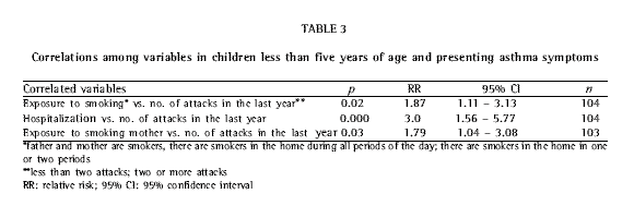 We also found a correlation between exposure to smoking in the home during two or more periods of the day and a history of more than two attacks during the last year. However, when this relationship was analyzed regarding close living quarters, it was observed that when there were three or more people in the bedroom with the child the correlation between periods and attacks persisted, whereas when there were less than three people in the bedroom with the child this correlation was not observed.