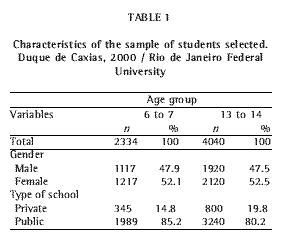 The return rate for the questionnaires distributed in the 13- to 14-year-old age group was 99.4%. This rate was lower (51.5%) in the younger age group. This might have been due to the fact that, for this age group, the participating schools sent the questionnaires to the parents to be completed and returned, which made direct supervision by the researchers impossible, increasing the number of unreturned questionnaires. Another factor to be considered is the motivation and cooperation of school employees charged with this task. Although the researchers had explained, in detail, the importance of the study and its repercussions for the community, interest in facilitating the study was not apparent in many schools, both public and private.