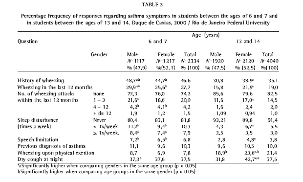In Duque de Caxias, The prevalence of wheezing within the last 12 months in the younger group was 27.7%, compared to 19.0% among the adolescents (p < 0.0001). Among 13-year-olds and 14-year-olds in other cities, these values ranged from 18.4% (in Curitiba) to 27% (in Salvador, in the state of Bahia), whereas among 6-year-olds and 7-year-olds, the prevalence of wheezing was 21.3% in São Paulo to 27.2% in Recife (in the state of Pernambuco)(10). The lack of a validation study in each investigated area suggests that these data contain errors(19). However, various environmental factors may explain differences in the prevalence among the various urban centers in a country of continental dimensions such as Brazil.