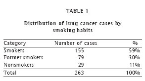 A retrospective study, comprising 263 patients definitely diagnosed with lung cancer, was carried out from January of 1991 to December of 1997. Data were collected from medical charts of the Hospital de Clínicas of the Federal University of Paraná and of the Hospital Erasto Gaetner, both of which are located in Curitiba.