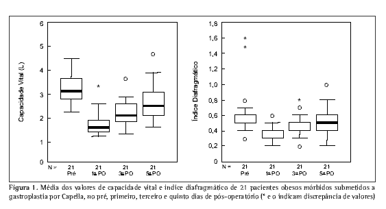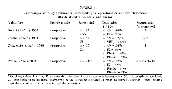Poucos são os estudos que abordam as alterações pulmonares no pós-operatório de CAA em pacientes obesos mórbidos(11,23-24). Ebeo, em 2002, comparou a função pulmonar nos períodos pré e pós-operatório em um grupo de obesos submetidos a gastroplastia e observou reduções de até 55% na capacidade vital forçada e no volume expiratório forçado no primeiro segundo(24).