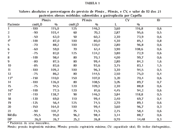 Finalizando, pudemos concluir que, no pós-operatório da gastroplastia por Capella para tratamento de obesidade mórbida, ocorreu diminuição dos volumes e capacidades pulmonares, além de força muscular respiratória, semelhante ao descrito na literatura para não obesos submetidos a cirurgia no andar superior do abdome, e que a incidência de complicação pós-operatória foi baixa nesta amostra populacional.