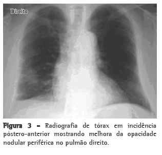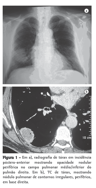 Ao exame físico, corado, hidratado, com murmúrio vesicular rude, estertores crepitantes em base de hemitórax direito, frêmito toracovocal aumentado e pressão arterial sistêmica de 120/80 mmHg. Oximetria de pulso com saturação de O2 de 96%. Foi iniciada a investigação com exames de imagem e laboratoriais. A radiografia de tórax mostrou opacidade nodular em terço inferior de hemitórax direito (Figura 1a); a radiografia de seios da face evidenciou espessamento de mucosa do seio maxilar esquerdo; e a TC de tórax, uma lesão expansiva no hemitórax direito (4,2 cm × 3,1 cm), contígua com a pleura parietal (Figura 1b). Diante disso, foi solicitada biópsia percutânea guiada por tomografia, cujo resultado mostrou áreas de fibrose e de extensa necrose associada a um processo inflamatório (Figuras 2a e 2b), cujas possíveis causas seriam: GW, granulomatose broncocêntrica ou doença infecciosa. Nos exames laboratoriais, foram encontrados: hemoglobinúria (+/4+), hematúria (29.000/mL), velocidade de hemossedimentação (27 mm/h), fator antinuclear reagente (1/40), pontilhado grosso, FR reagente (50,5 U/mL) e ANCA-c positivo. Após analisar os exames referidos, admitiu-se o diagnóstico de granulomatose de Wegener. Com a instituição do tratamento, evoluiu com melhora das manifestações clínicas e resolução da imagem pulmonar (Figura 3).