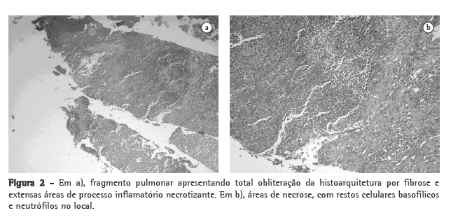 A biópsia pulmonar mostrou alterações incompatíveis com neoplasia. Revelou quadro de extensa necrose associado à vasculite com necrose de parede, compatível com as hipóteses diagnósticas de GW e granulomatose broncocêntrica, dentre outras doenças granulomatosas e pseudotumor inflamatório.