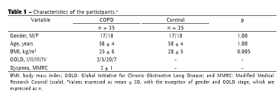 The control group comprised 35 healthy volunteers, recruited from among employees of the institution of from among members of the community, who were matched to the COPD patients for age and gender. Individuals were selected by means of an interview focusing on general health status, history of smoking, and occupational history, as well as on current and previous diseases. The control group exclusion criteria were as follows: being a current or former smoker; having been hospitalized in the last 12 months; having a sedentary lifestyle; having a history of pulmonary diseases, including childhood asthma or bronchitis (or both); having a history of neurological disease, heart diseases, neoplasia, oropharyngeal surgery, or laryngotracheal surgery; and having a history of occupational exposure to toxic substances.