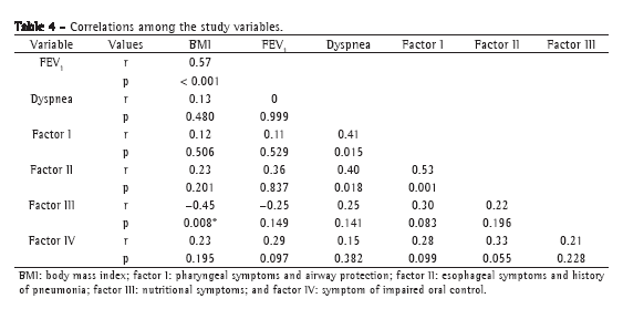 The study group was assessed regarding the following variables: COPD severity; sensation of dyspnea; body mass index (BMI); and symptoms of dysphagia. Disease severity was characterized by FEV1, as measured by spirometry. Dyspnea was quantified by the Modified Medical Research Council (MMRC) scale, which comprises 5 questions (for which the scores ranged from 1 to 5) based on the different degrees of physical activity that cause shortness of breath. A higher score translates to a greater degree of dyspnea.(17) The BMI was calculated by dividing weight (in kg) by height (in m2). The index was expressed in kg/m2, in accordance with the norms of the National Institutes of Health and of the National Heart, Lung and Blood Institute. The BMI was included as a variable because patients with COPD present with weight loss and a low BMI.(18)
