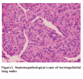 To conclude, the presence of multiple pulmonary lesions (micronodules), such as in this case or in isolated cases, in patients with meningiomas (resected or not), should serve as a guide for those treating intrapulmonary metastases from meningiomas. The significance of these micronodules in the evolution and prognosis of the disease, as well as in determining treatment options, remains to be clarified.