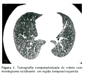 Concluindo, a presença de lesões pulmonares múltiplas (micronódulos), como neste caso, ou isoladas, em pacientes portadores de meningioma (ressecados ou não), deve orientar para a possibilidade de se tratar de metástases intrapulmonares de meningioma. Sua importância na evolução e prognóstico da doença, bem como nas possibilidades terapêuticas, ainda devem ser esclarecidas.