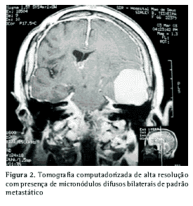 As metástases pulmonares do meningioma freqüentemente apresentam-se como lesão única ou, mais raramente, como múltiplos nódulos não calcificados e de tamanhos variados(9), o que torna mais raro o presente caso. A presença de sintomas respiratórios em nossa paciente pode ser explicada pela extensão do comprometimento pulmonar, uma vez que a paciente apresentava quadro funcional restritivo e alteração significativa na medida da difusão pulmonar do monóxido de carbono, sem concomitância de outra doença respiratória.