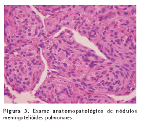 O radiograma simples de tórax apresentava infiltrado intersticial reticulonodular difuso. A tomografia computadorizada de tórax de alta resolução (Figura 2) revelou a presença de micronódulos disseminados por ambos os pulmões. Os exames laboratoriais eram normais. A avaliação da função pulmonar apresentou os seguintes valores: capacidade vital forçada de 2,0 L (86%), volume expirado forçado no primeiro segundo de 1,62 L (98%), capacidade pulmonar total de 3,34 L (87%), volume corrente de 1,10 L (73%) e difusão do monóxido de carbono de 10,18 ml/min (61%). Foi realizada uma fibrobroncoscopia com lavado broncoalveolar e biópsia transbrônquica, sem que se obtivesse o diagnóstico definitivo. A paciente foi então submetida à biópsia pulmonar a céu aberto, com retirada de fragmentos em cunha de lobo médio e de lobo inferior direito. O resultado anatomopatológico apresentou múltiplos focos de proliferação intersticial de células fusiformes e ovaladas de aspecto meningotelial (Figura 3). Esse resultado apresentava similaridade com o tumor ressecado da região temporal esquerda do sistema nervoso central, cujo exame anatomopatológico demonstrou se tratar de meningioma fibroblástico. O tratamento oferecido à paciente, quanto às metástases pulmonares do meningioma, foi expectante, com manejo sintomático e acompanhamento ambulatorial.
