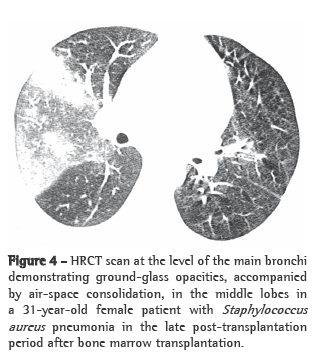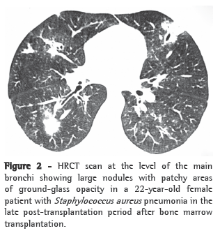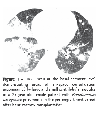 Pulmonary infections are a common cause of morbidity and mortality following bone marrow transplantation (BMT).(1,2) The most common pathogens are bacteria, fungi and viruses.(3-6) Few previous studies have discussed the HRCT findings in patients presenting bacterial pneumonia after BMT.(4-14) The aim of this study was to describe HRCT findings in such patients.
